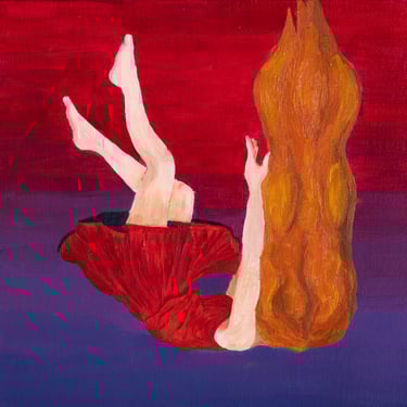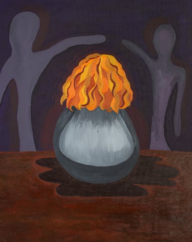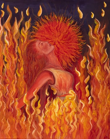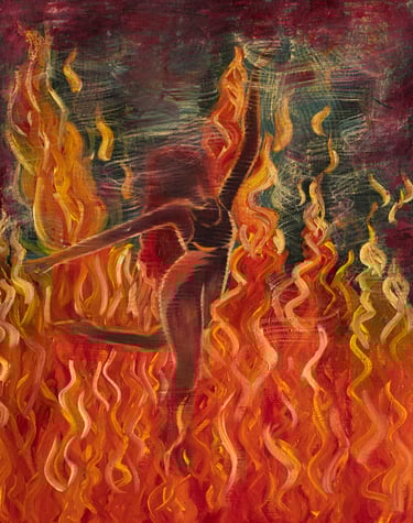 Em “Aquilo que Arde em Mim”, o fogo é força vital e rito de passagem. Uma figura feminina dança entre chamas que não a consomem: moldam-na. Nas pinceladas entre controle e impulso, ela entrega-se e renasce como fênix. O rosto borrado revela o eu em transformação; luz e sombra fundem corpo e fogo. Arder é iluminar: libertação e autoconhecimento.