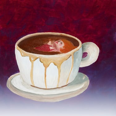 Cores quentes contrastam com o tema, revelando a dor que se disfarça de calma. A figura não suplica, apenas é. Um instante entre o cansaço e a rendição.