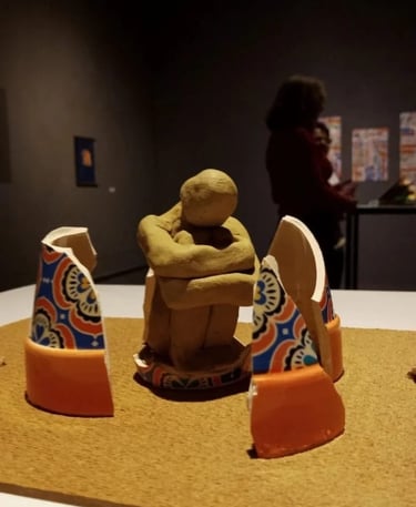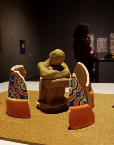 “Irrompimento” transforma um vaso quebrado em metáfora da resiliência. Cacos reorganizados sobre madeira contrastam com uma figura vulnerável, simbolizando a explosão de sentimentos.