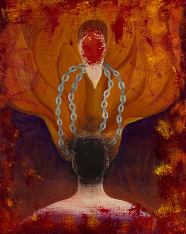 Em “Dependência Emocional”, duas figuras se unem por elos que confundem afeto e prisão. A obra revela o peso de depender do outro, moldando o próprio brilho em função de quem se ama, apagando-se aos poucos. Cores quentes mostram um laço que arde, mas não ilumina.