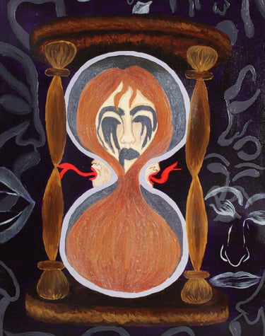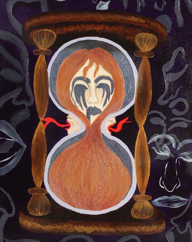 “Refém do Tempo” mostra a artista aprisionada numa ampulheta, vendo a vida escorrer. Lá fora, fantasmas do passado zombam em figuras fragmentadas que repetem o ciclo depressivo.