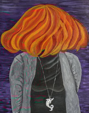 Em “Ecos do Passado”, a memória é circular: lembranças retornam em busca de cura. Uma figura feminina de olhos cobertos revela dificuldade de ver a própria dor, cercada por símbolos do inconsciente — mão controladora, corpo fetal, meia-lua. Entre vermelhos e ocres, pinceladas controladas e impulsivas sinalizam o desprendimento. A obra convida à introspecção e à ressignificação rumo à cura.